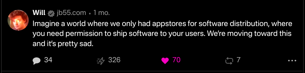 Removing the middleman and letting users pay developers directly via zaps, Nostr Wallet Connect or other similar primitives will fundamentally change the way apps are funded and distributed.